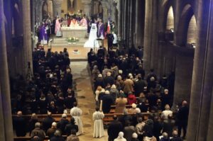 Monseigneur Matthieu DUPONT, 16e évêque de Laval, a été ordonné le samedi 09 mars en la Basilique de Pontmain. Il a été installé sur le siège apostolique de la cathédrale de Laval le dimanche 10 mars. En tant que successeur des apôtres, il veille sur la communauté catholique de la Mayenne – prêtres, diacres, laïcs engagés dans l’Eglise, religieux, et tous les baptisés. Il a pour mission d’enseigner et de transmettre fidèlement la foi catholique dans le diocèse de Laval. Il préside les assemblées, administre les sacrements et nous guide.