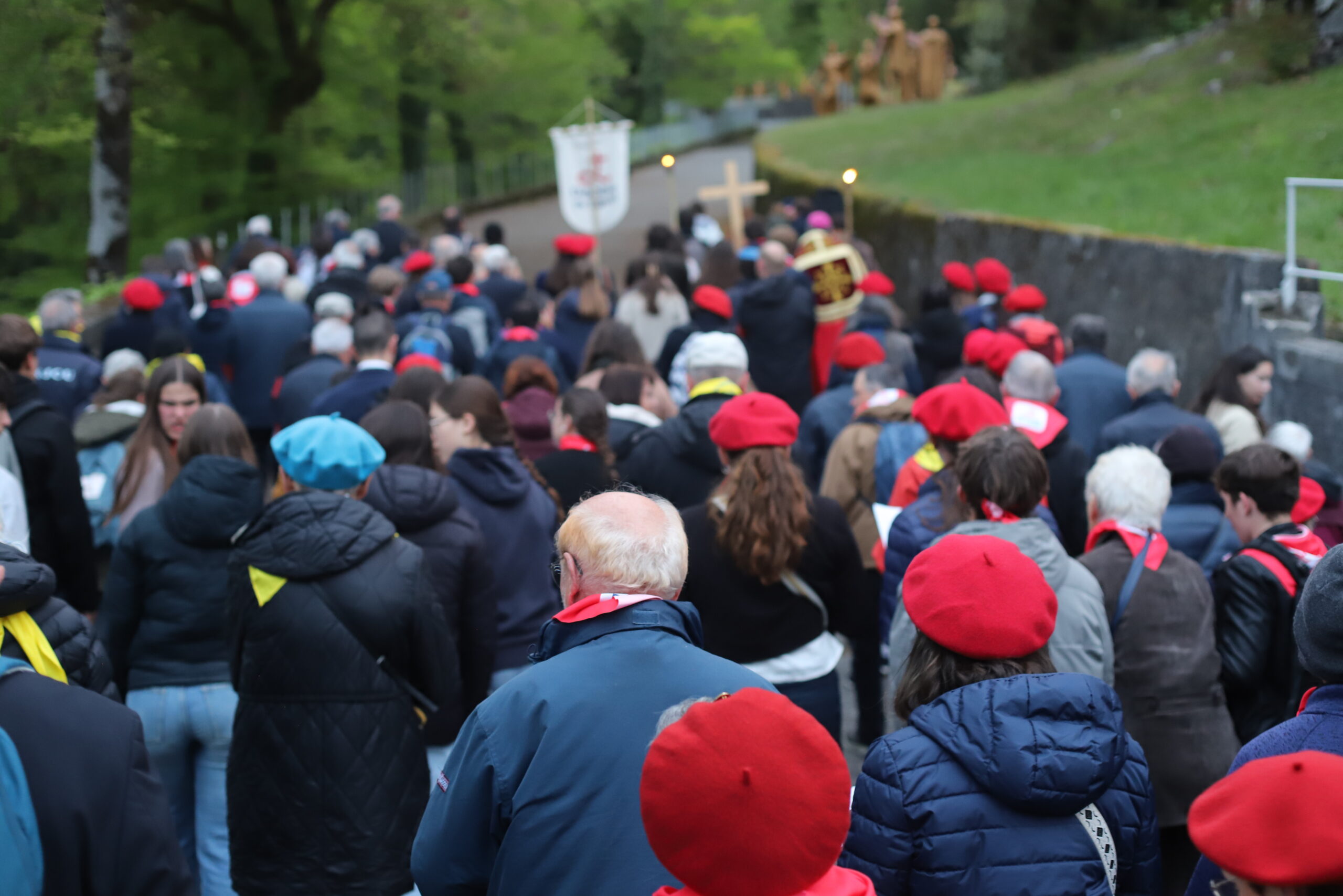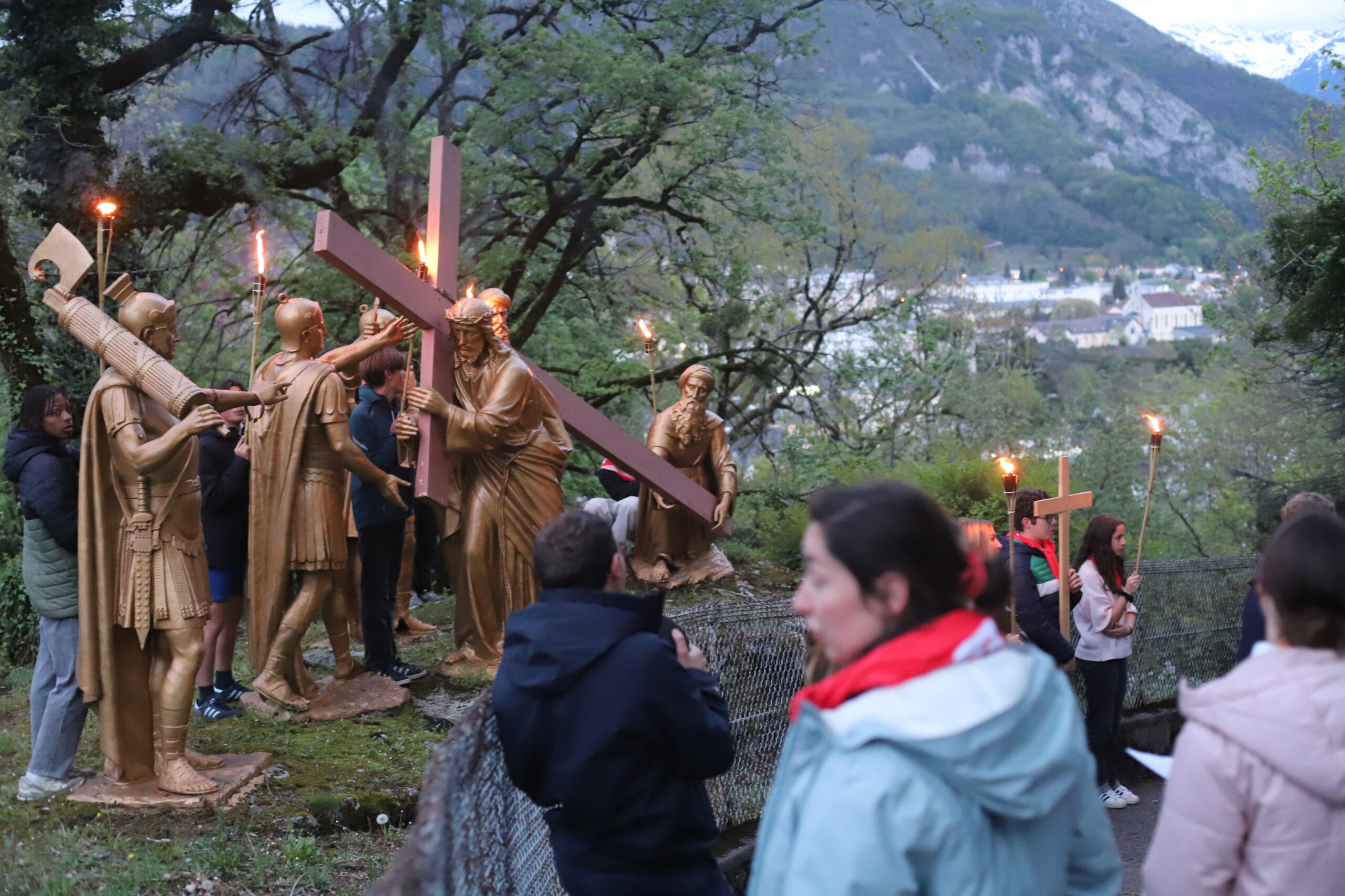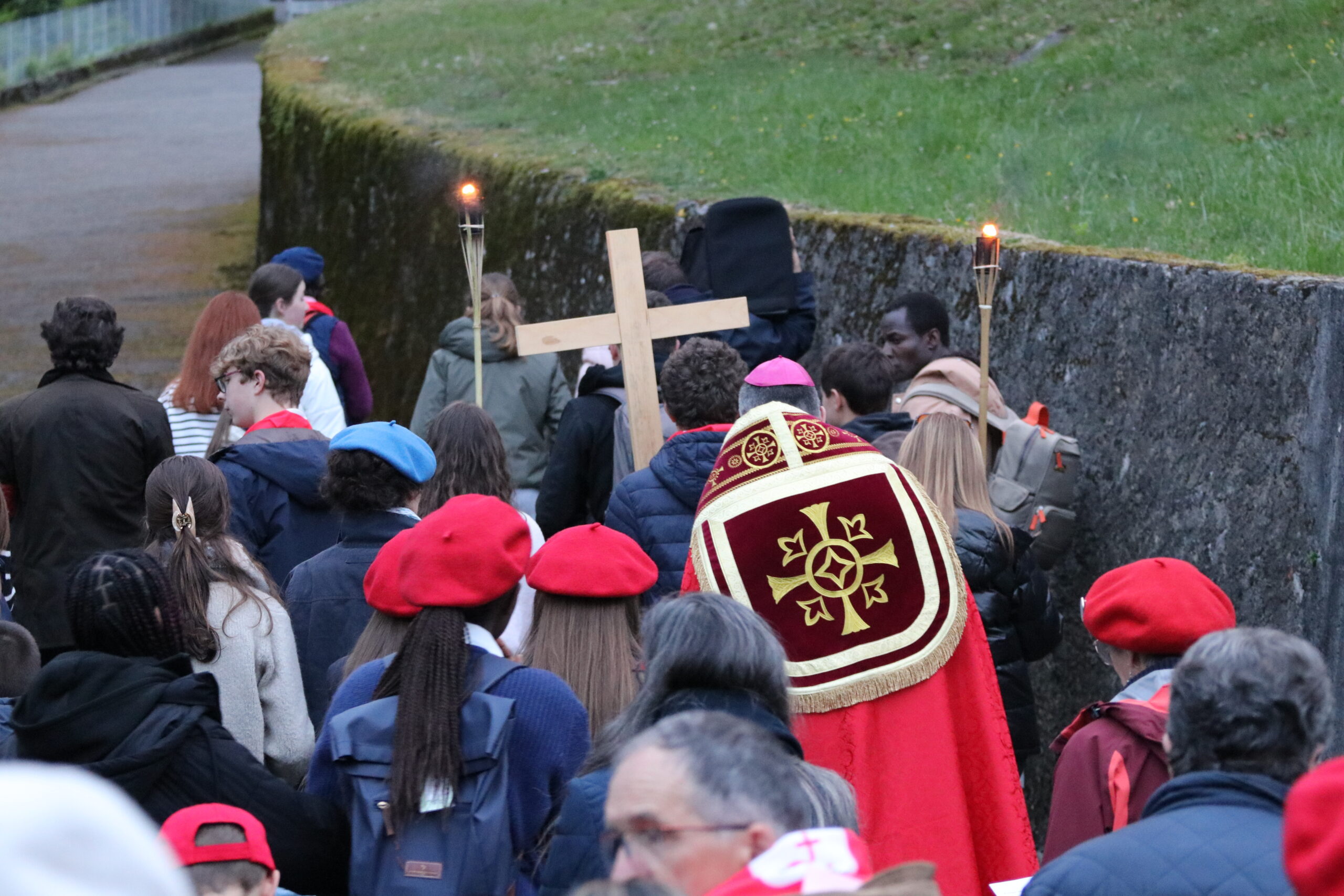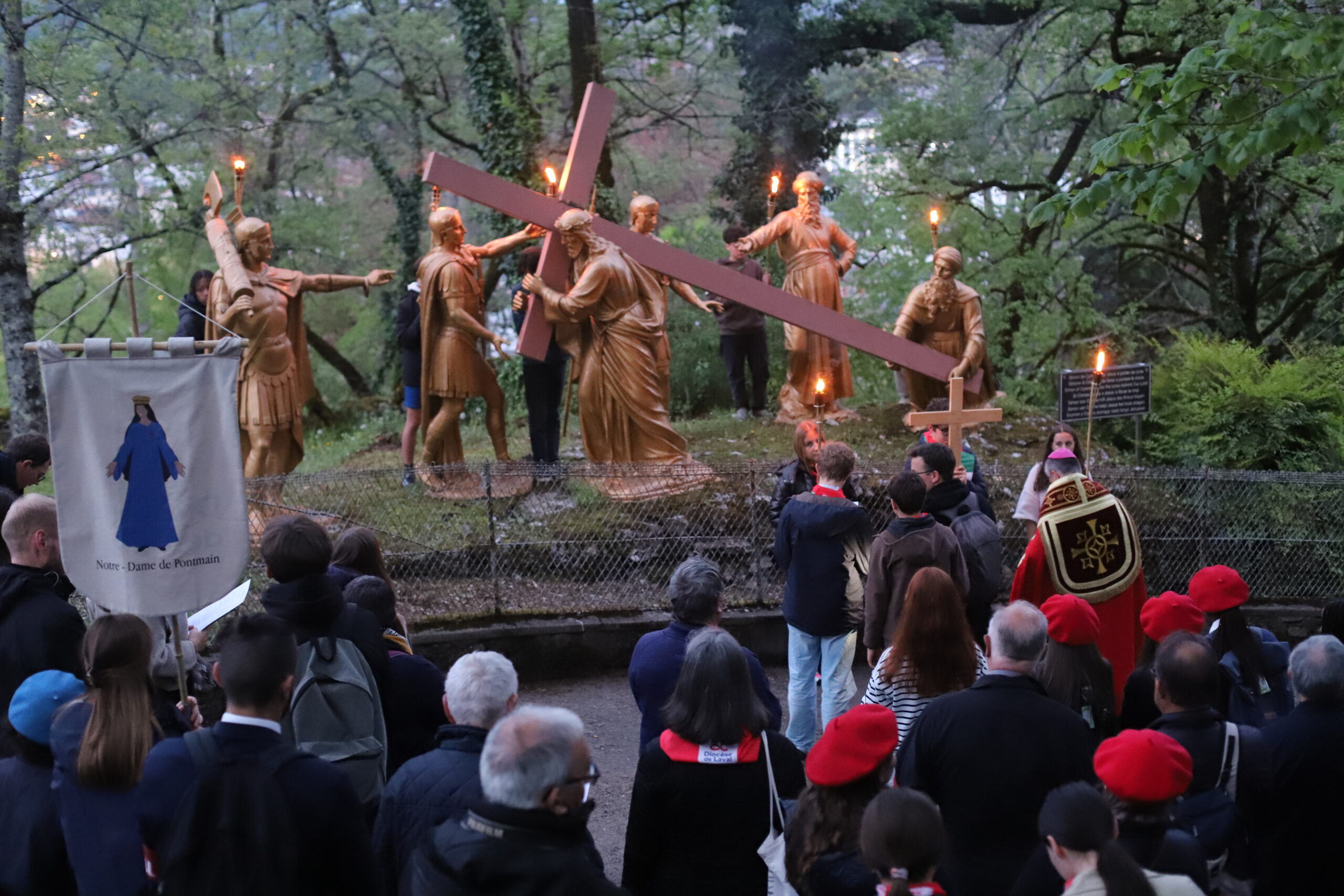 Étant dans le temps pascal, nous avons été invités à revivre la Passion et la Résurrection de notre Seigneur Jésus-Christ. Ce temps a été animé par le pélé jeunes du diocèse. Ce moment de mémoire de la mort et de la Résurrection du Christ a été confié à de nombreuses intentions, notamment celle de la paix dans le monde. Le chemin de croix de Lourdes est particulièrement fort, car il est escarpé et difficile à parcourir, très pentu, rappelant ainsi le chemin exigeant de Jésus jusqu’au Golgotha. Ce temps nous a aussi permis de nous confier au Seigneur, de lui remettre nos pauvretés ainsi que les intentions de prière que nous portons sur la croix, pour bien commencer ce pèlerinage à Lourdes.