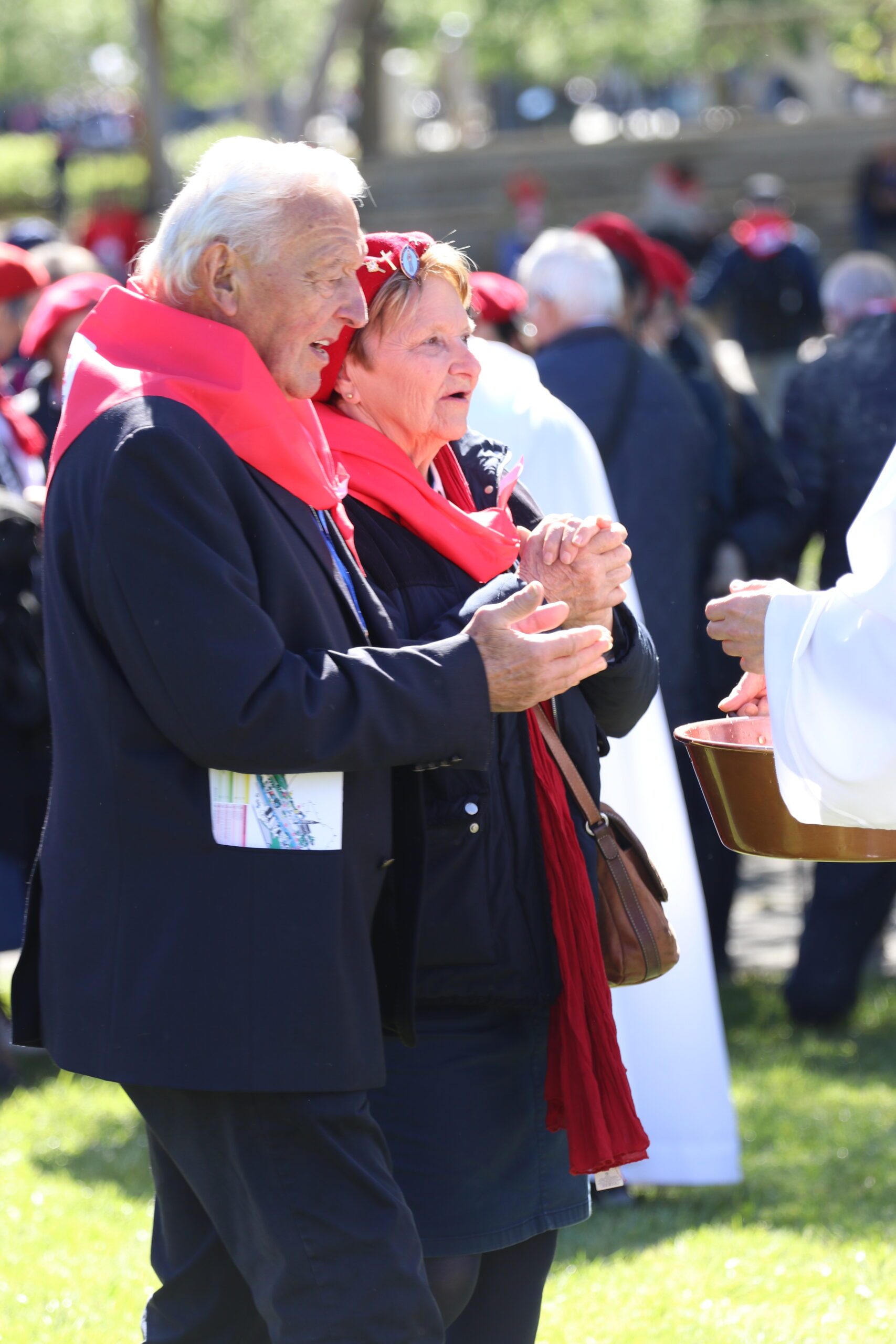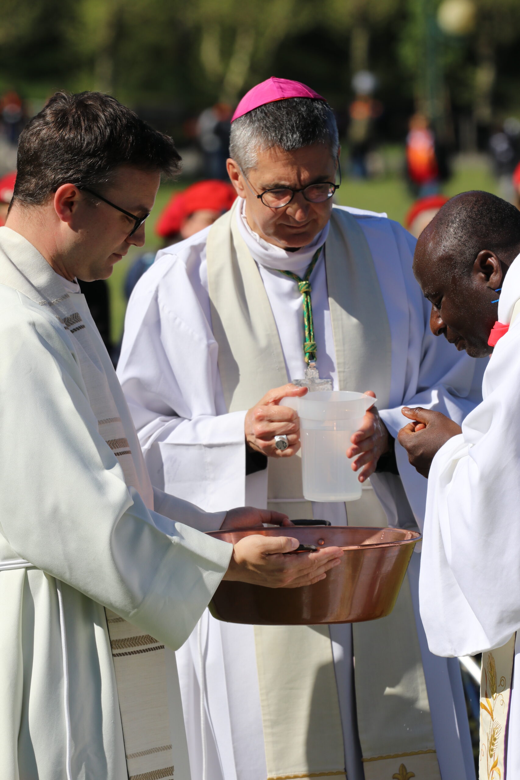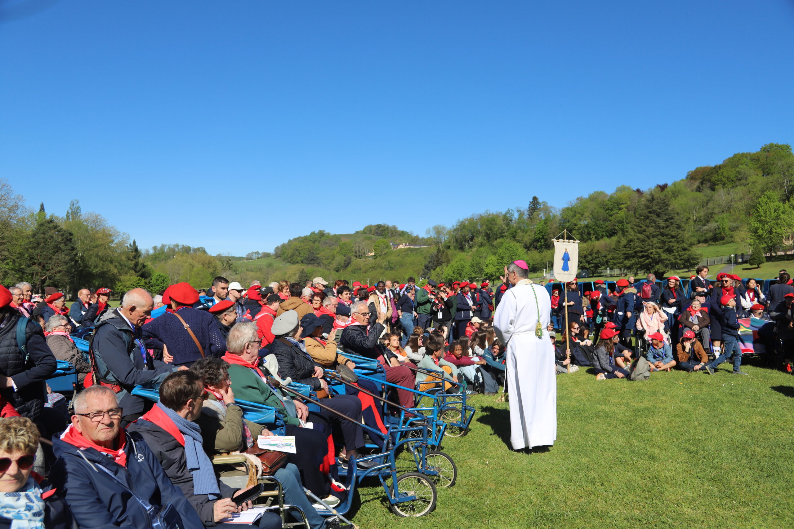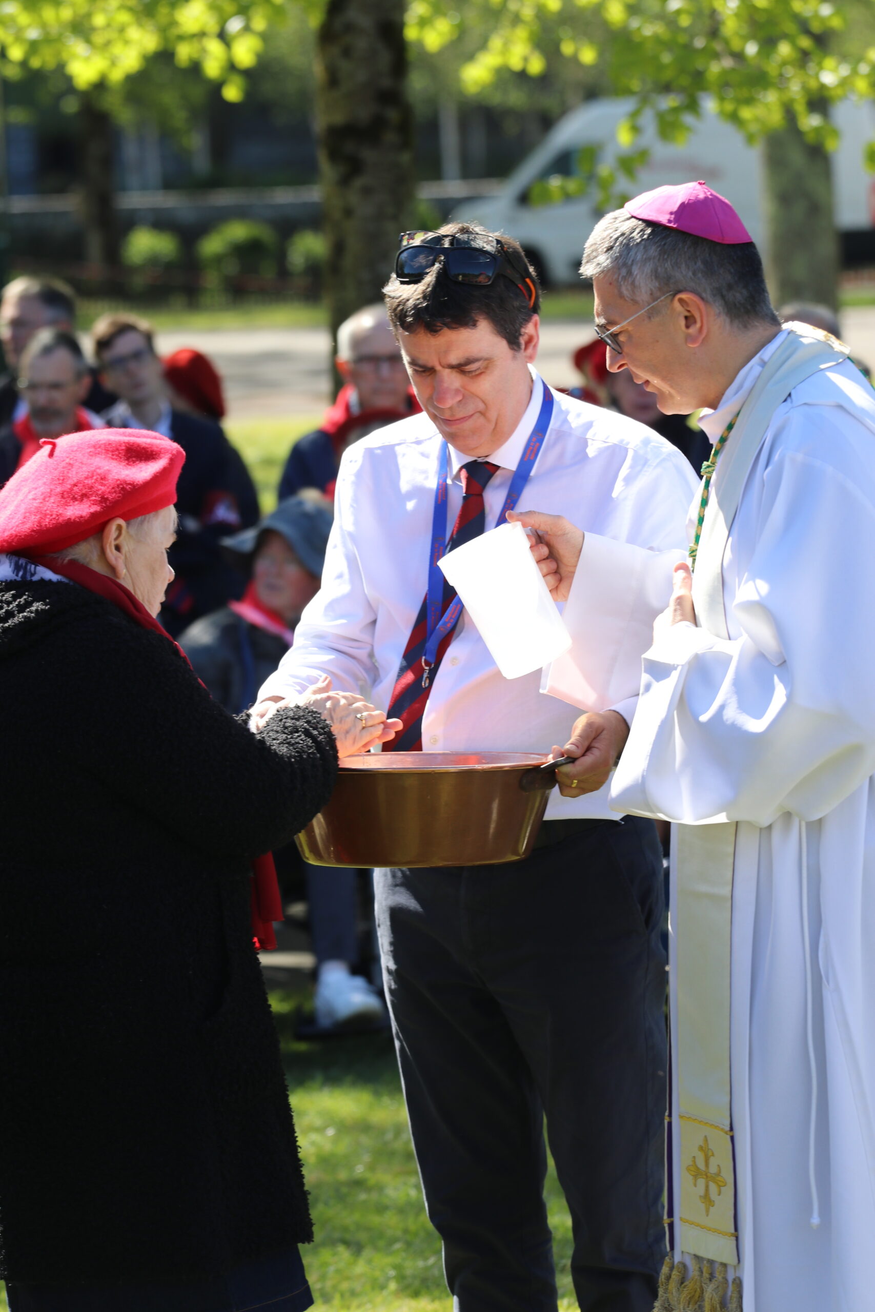 Les pèlerins, rassemblés autour des prêtres du diocèse et de notre évêque, ont vécu le geste de l’eau. Ce geste a été accompli par Bernadette à la demande de la Vierge Marie lors des apparitions de Lourdes. De la même manière, nous étions invités à plonger nos mains ou, selon nos capacités, à recevoir l’eau de Lourdes, à en boire et à nous recueillir auprès de la Vierge Marie. Ce moment, vécu par les différentes délégations du pèlerinage du diocèse de Laval, a été particulièrement fort et a permis de démarrer spirituellement cette semaine à Lourdes de la meilleure des façons. Merci, Marie, pour ton eau qui purifie.