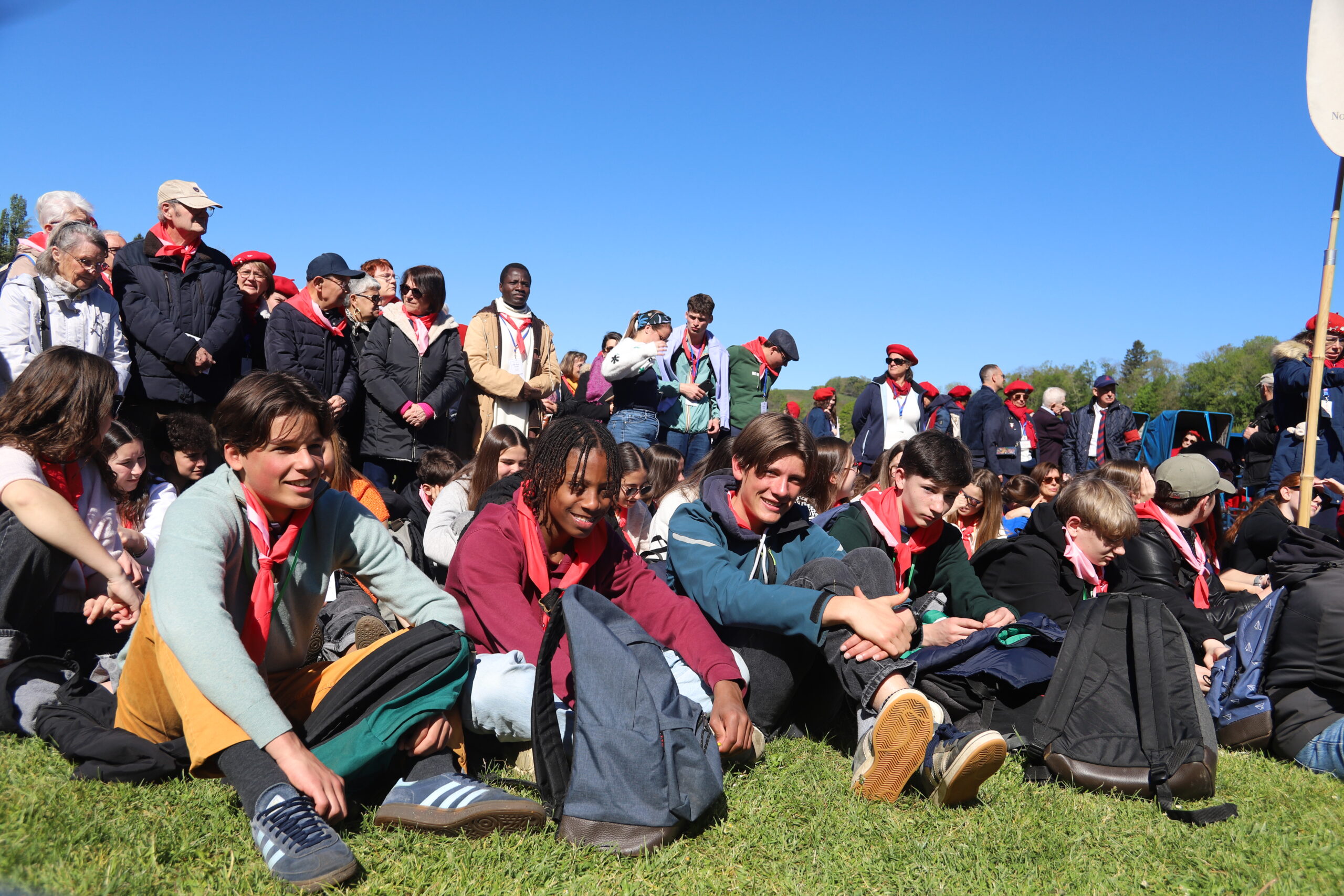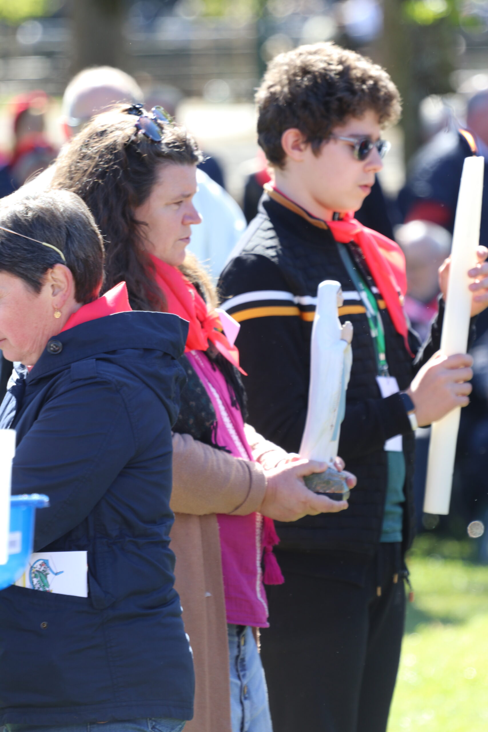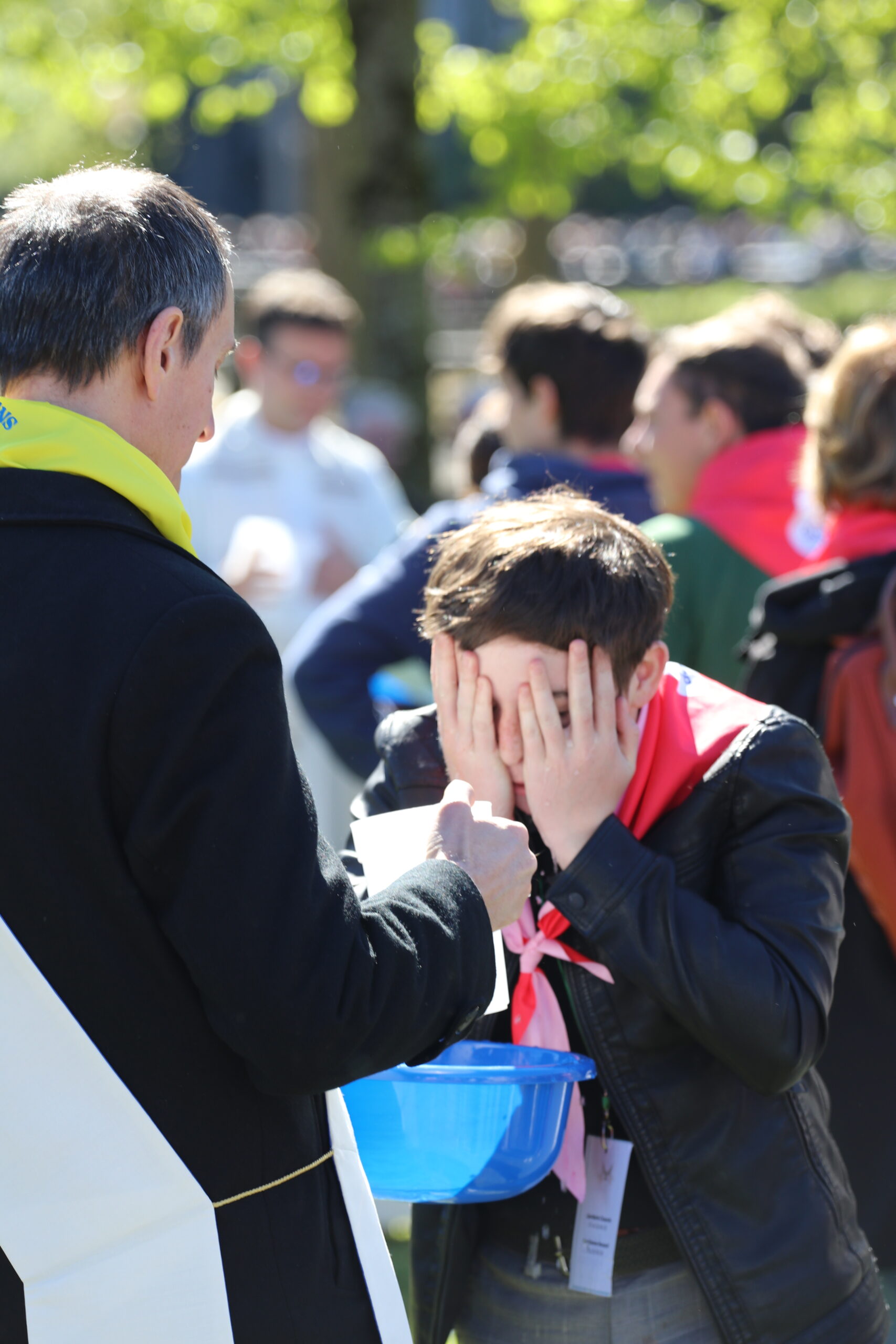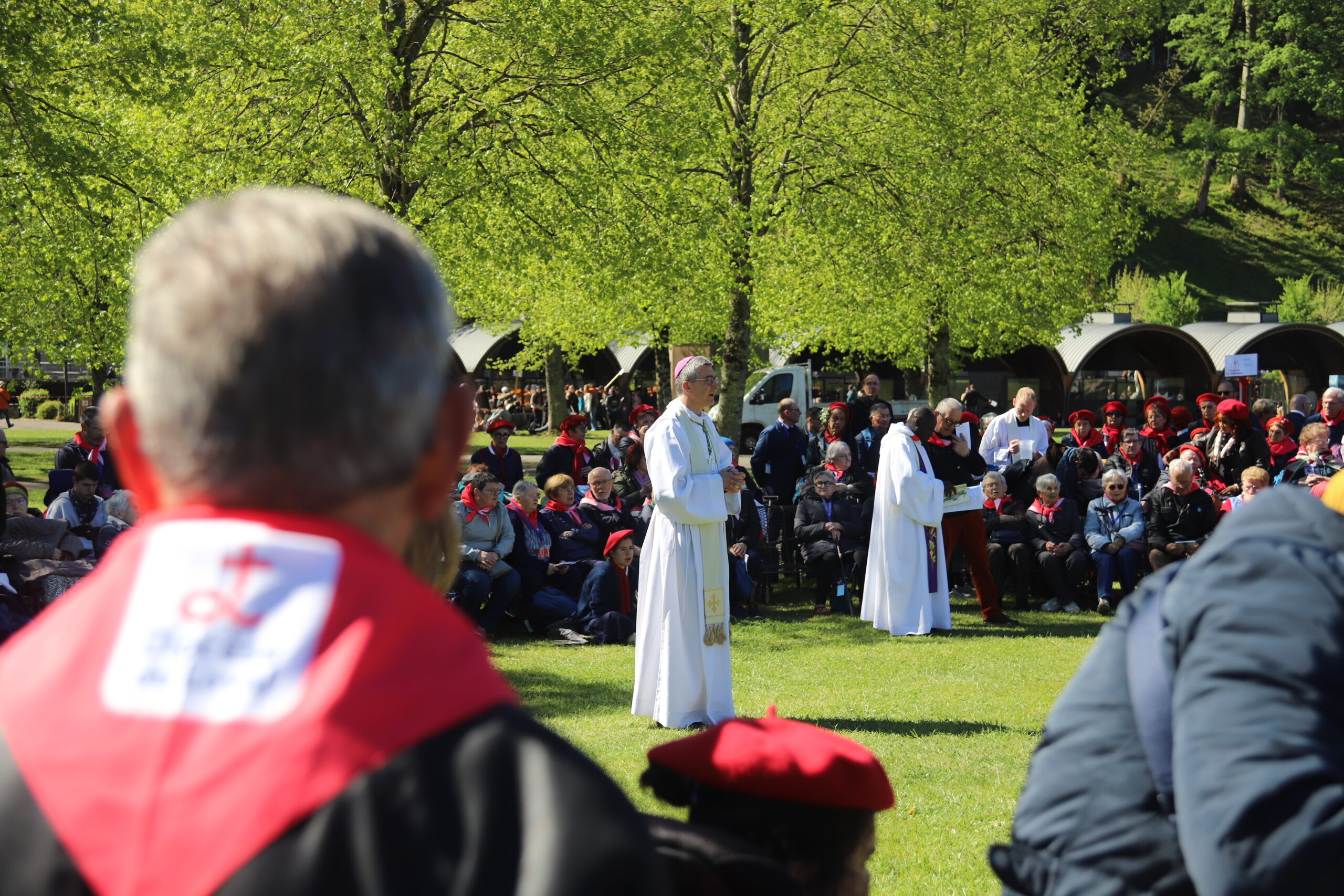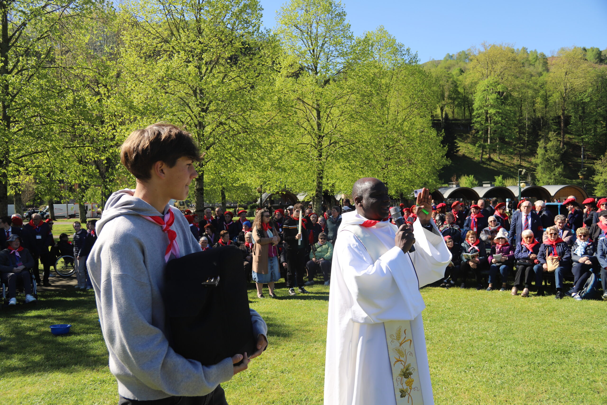 Les pèlerins, rassemblés autour des prêtres du diocèse et de notre évêque, ont vécu le geste de l’eau. Ce geste a été accompli par Bernadette à la demande de la Vierge Marie lors des apparitions de Lourdes. De la même manière, nous étions invités à plonger nos mains ou, selon nos capacités, à recevoir l’eau de Lourdes, à en boire et à nous recueillir auprès de la Vierge Marie. Ce moment, vécu par les différentes délégations du pèlerinage du diocèse de Laval, a été particulièrement fort et a permis de démarrer spirituellement cette semaine à Lourdes de la meilleure des façons. Merci, Marie, pour ton eau qui purifie.